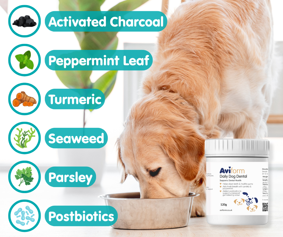 Adding a daily supplement such as Aviform Daily Dog Dental provides consistent support regardless of what your dog eats.